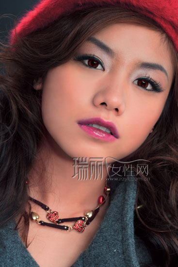 选择两种色彩的红色系唇膏,一种是偏冷的紫红色,一种偏暖的深玫瑰红色。冷色调唇膏作为亮色塑造唇部亮的层次,而偏暖的色彩用在嘴唇的内侧,制造阴影感。想要实现自然妆效要弱化唇部轮廓。